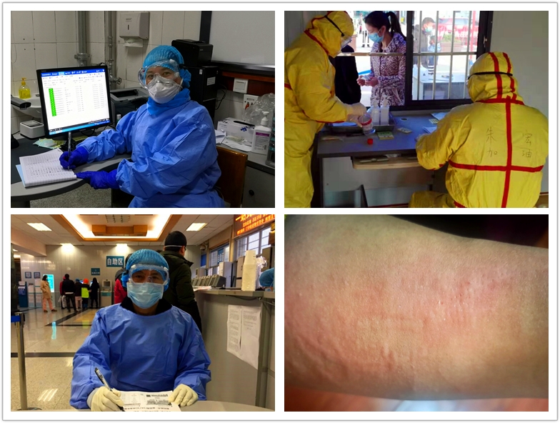 春节伊始,中医科召回全体医护人员在长沙待命支援。中医科主任肖岚不顾自己的腰痛、脚术后损伤,副主任朱宏顾不上刚刚读小学的儿子,李广诚、黄飞燕老师忘记自己的“半百”之龄,任丹、李若梦忍痛离开尚在怀里呀呀学语的稚儿,张婷放下年迈母亲及年幼儿子,纷纷投身医院急诊发热门诊、感染科隔离病房、门诊预检分诊等一线战场进行抗疫支援。带着起雾的防护目镜、穿着湿透内里的隔离衣、脸上满是口罩目镜的压痕,皮肤生出过敏湿疹, 6-8小时不吃不喝不拉是常态……面对重重压力、各种困难,没有人退缩,他们说:“特殊时期,为守好疫情防控,能尽一份力就能安心!”中医科副主任朱宏第一时间报名支援门诊预检分诊和感染科隔离病房,“我就是医院的一块砖,哪里需要往哪里搬。”他由于乳胶手套过敏,以至手腕手臂发红、瘙痒厉害,吃完抗过敏药物,继续坚守岗位。疫情期间医院急诊人手短缺、患者救治工作繁重,亟需支援,年近五十的主任肖岚带头报名支援急诊第二发热门诊,带领科室中青年医生张婷、任丹投身急诊抗疫战场。随着门诊的逐步开放,为防止疫情反扑,医院门诊预检分诊的压力很大,中医科朱宏、肖岚、任丹、李若梦、李广诚、黄飞燕……等医生先后加入支援预检分诊工作。在繁重的一线抗疫工作之余,肖岚、朱宏、张婷还参与了线上答疑咨询中医门诊,为不能来医院就医看病的患者无偿提供医疗帮助。