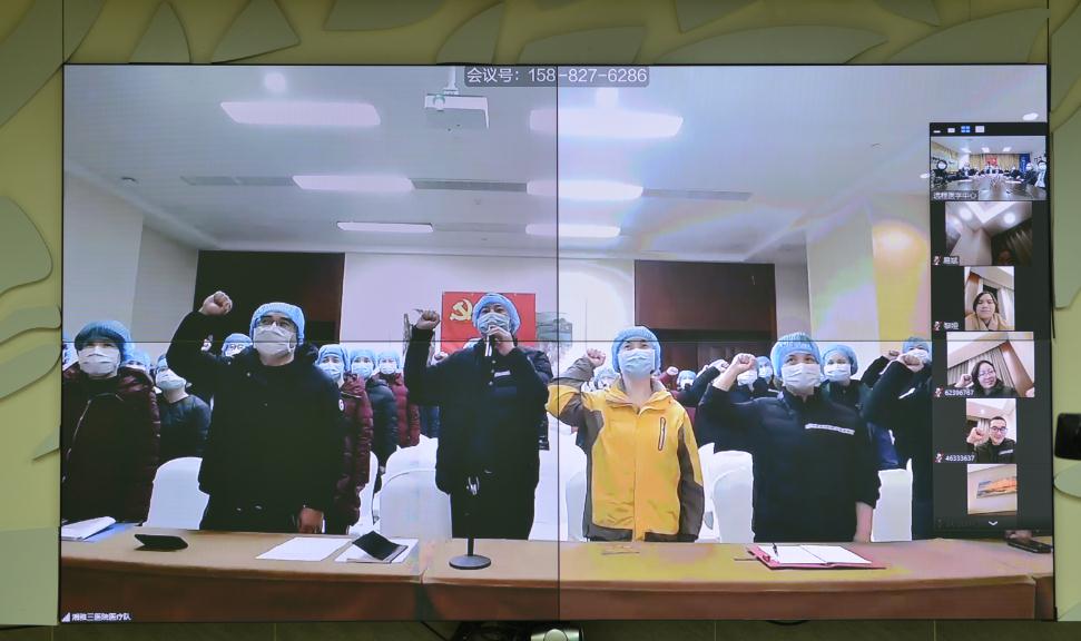 在党员先锋的带领下,这46名同志不仅在实际行动上向党组织靠拢,更是在并肩作战中和党组织融为一体。2月25日,中南大学湘雅三医院党委书记何庆南以“疫情大考中国共产党人的责任和新湘雅人的作为”为主题,为支援湖北医疗队入党积极分子讲党课。在党课结束后,他们和前线共产党员一同发出了“疫情不退,我们不归”的铿锵誓言。