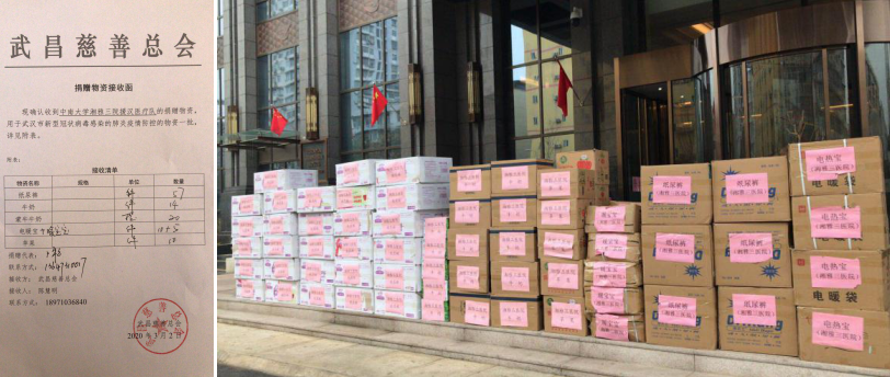 3月2日,湘雅三医院援助武汉医疗队向武昌慈善总会捐赠一批物资,用于武汉市新型冠状病毒感染的肺炎疫情防控。物资包括纸尿裤、牛奶、电暖宝、苹果等生活用品。