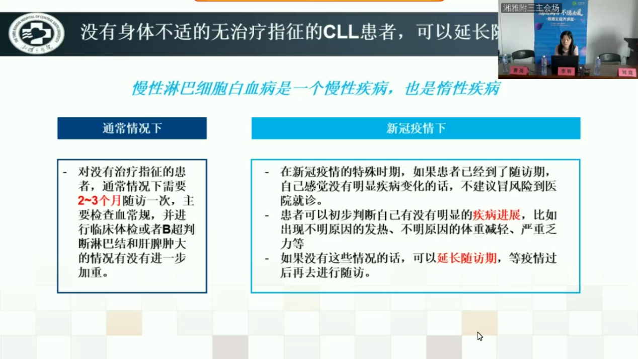 李昕教授系统讲解了新冠时期初治CLL诊疗策略。她指出,如果患者出现了比较明显的进展,又没有办法到医院进行治疗时,可考虑调整为口服药物方案,如使用BTK抑制剂(伊布替尼)作为口服用药居家治疗。另外, 她还对居家用药时出现的不良反应及处理方案进行了详细的说明。
