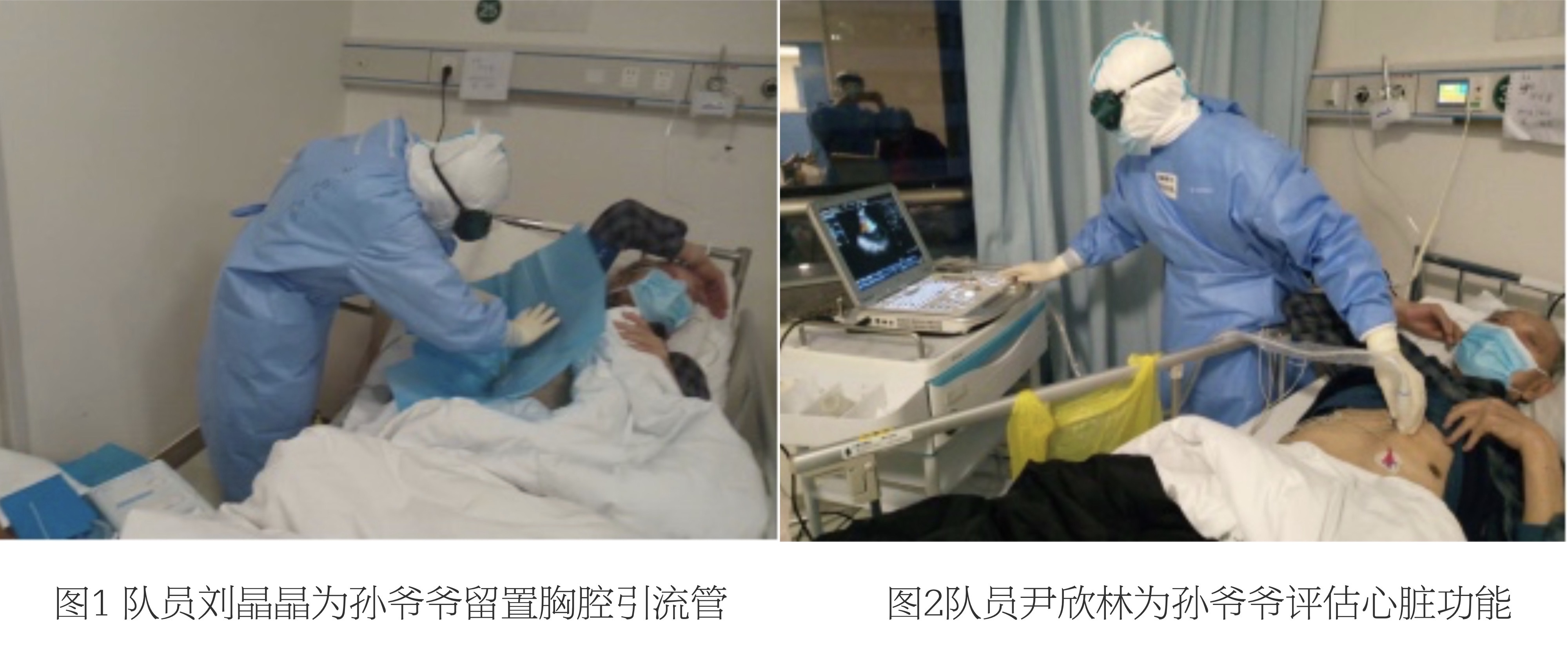 21天前,孙爷爷和老伴一起转入同济中法院区时,已发病10多天。他入院时精神很差,不愿活动,即使在高流量吸氧的情况下,氧饱和度也只有91-95%。患者合并了冠心病、房颤、下肢静脉血栓等疾病。在治疗过程中,一度出现病毒损伤心功能的情况,出现了明显的下肢水肿、胸腔积液,病情危殆。肖雪飞组长多次组织病例讨论,同时将病例汇报给后方的湘雅三医院远程医疗专家组。孙爷爷病情的恶化引起了后方专家组和院领导的重视。