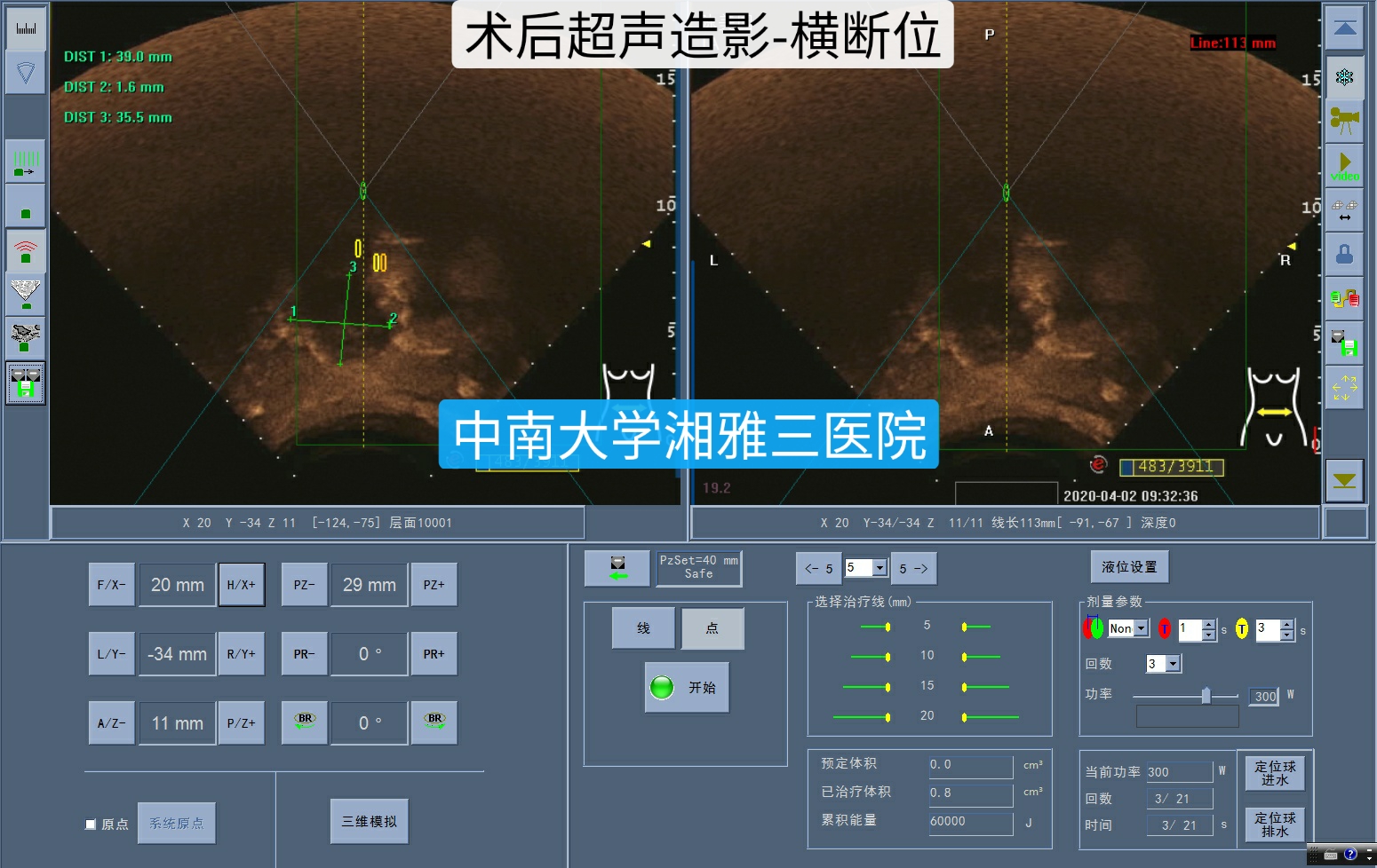 经过医院海扶治疗中心术前定位,评估可行性后,完善术前准备,于4月2日在镇静、镇痛麻醉方案下行胰腺肿瘤“海扶刀”治疗,术中辐照200秒,治疗总时间23分钟,患者术中无任何不适,生命体征平稳。术后超声造影提示:病灶内无血流灌注区,达到预期治疗效果。