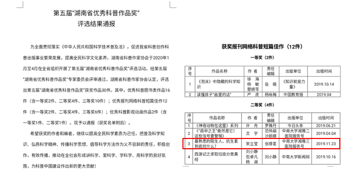 4月18日,湖南省科普作家协会通报第五届“湖南省优秀科普作品奖”评选结果,中南大学湘雅三医院药学部宋立莹主管药师主笔撰写、党委宣传部张璟茗编辑的科普文章“最熟悉的陌生人,抗生素到底抗什么”,荣获湖南省优秀报刊网络科普短篇佳作二等奖。此篇科普短文于2019年抗菌药物宣传周首发在“中南大学湘雅三医院”公众号上,阅读量迄今已过万。