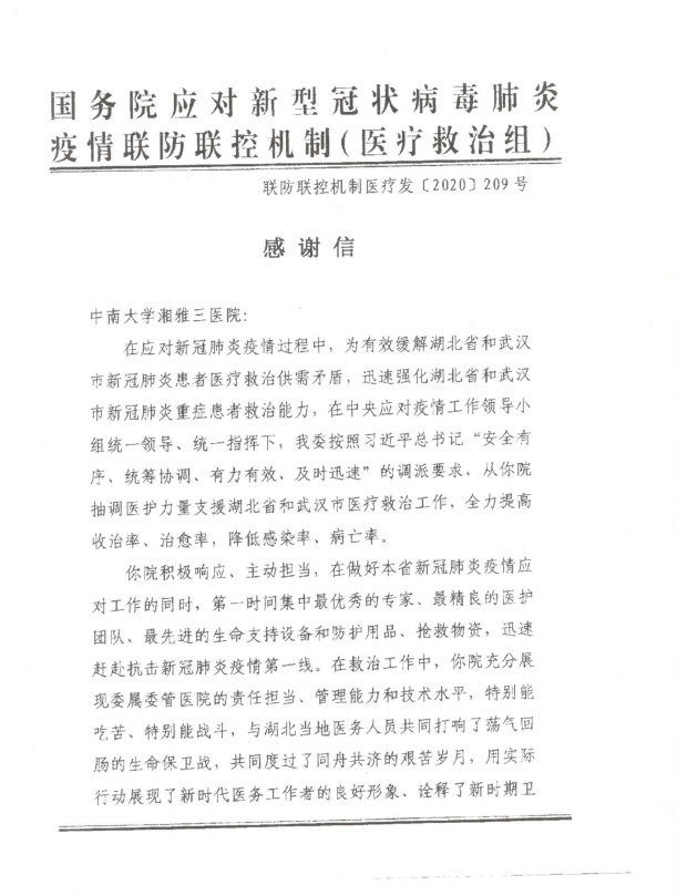 4月17日,国务院应对新型冠状病毒肺炎疫情联防联控机制(医疗救治组)发来感谢信,感谢中南大学湘雅三医院在疫情危难时刻抽调医护力量支援湖北省和武汉市医疗救治工作。