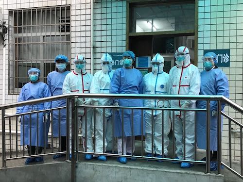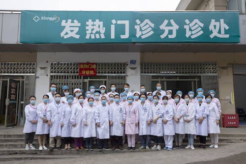 4月30日10时许,曾经支援过发热门诊的医护人员与医院党委书记何庆南、院长张国刚等相关院领导一道,来到发热门诊前坪拍摄了这张珍贵的“全家福”。