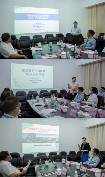在座谈会上,王智彪教授作了题为《中国原创聚焦超声技术的研究、应用和发展状况》的专题报告,讲述了中国原创聚焦超声技术从筚路蓝缕、砥砺前行直至走出中国、走上国际,为世界所认可的历程,以及未来聚焦超声技术发展的思考;石丘玲教授关于《聚焦超声技术临床应用研究》的汇报得到了与会领导和专家的一致好评,为湘雅三医院未来的临床科研工作开拓了思路。