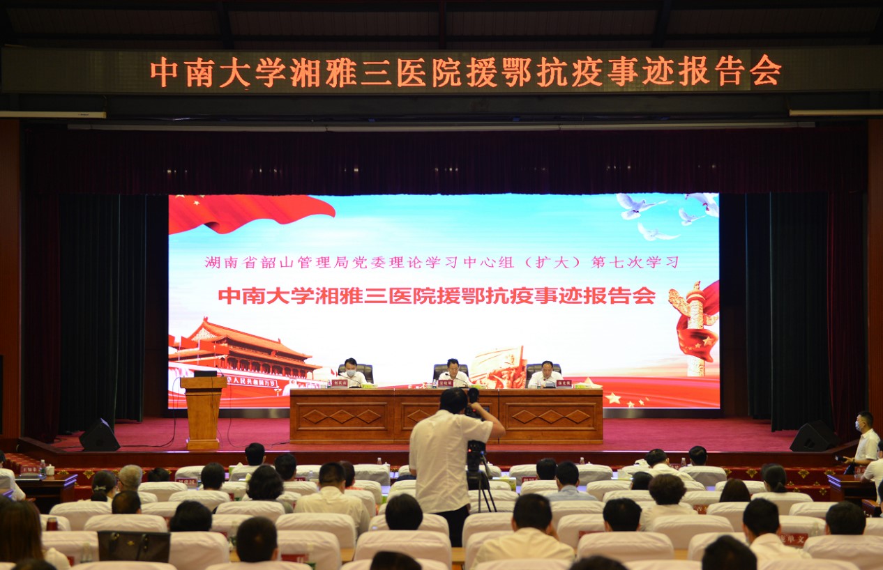 5月22日上午,韶山毛泽东同志纪念馆报告厅内不时响起阵阵掌声,中南大学湘雅三医院援鄂抗疫事迹报告会第四场走进了伟人故里韶山。应韶山管理局邀请,医院党委书记何庆南,带领王知非、钟竹青、张晓伟、刘佳等四位援鄂队员,及医院党办、党委宣传部、团委部分同志前往交流。韶山管理局党委书记、局长晏晓明,党委委员、副局长汤光强、付维华,二级巡视员萧国梁出席报告会。韶山管理局党员代表、入党积极分子、共青团员100余人现场聆听了援鄂队员在武汉一线的抗疫经历和故事。