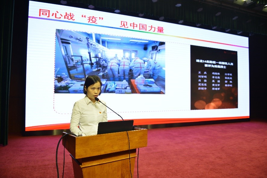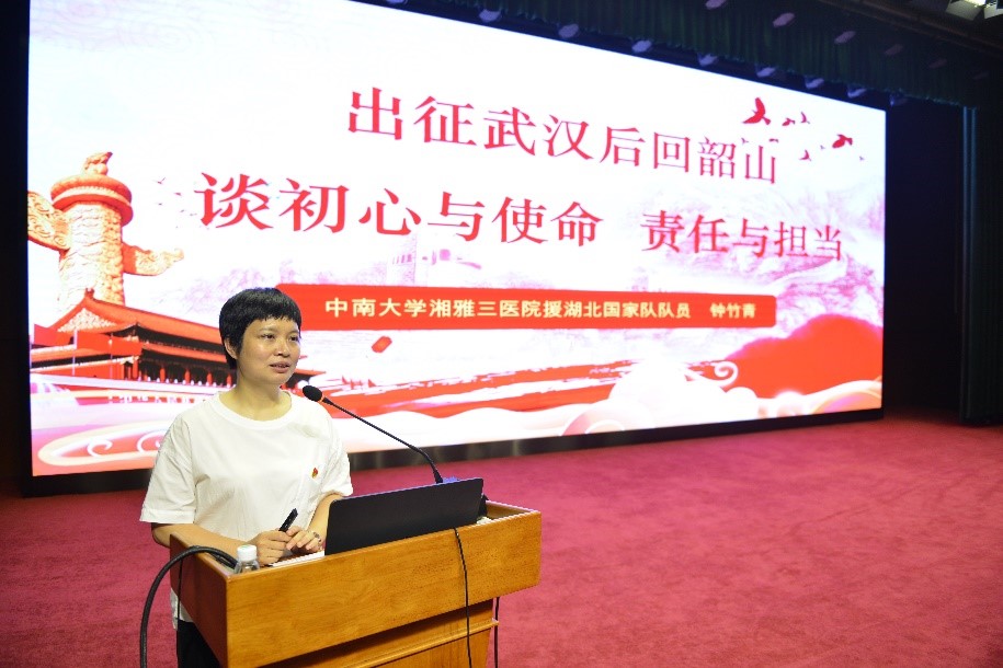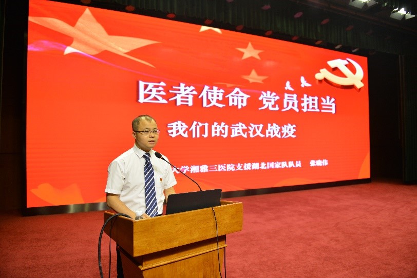 慷慨赴荆楚,白衣作战袍。在播放湘雅三医院援鄂纪录片后,四位援鄂队员逐一登台,讲述驰援湖北的点点滴滴,分享了52天抗疫战斗的心路历程。