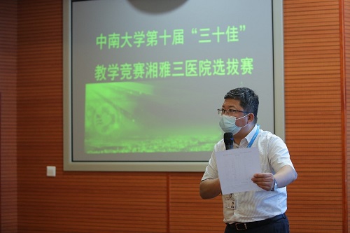 6月22日,中南大学湘雅三医院工会和教务部联合举办2020年中南大学第十届“三十佳”教学竞赛湘雅三医院选拔赛。医院党委书记何庆南,院党委副书记、工会主席杨飞龙出席。中南大学教师教学发展中心主任金一粟、基础医学院副院长管茶香、本科教学督导专家周昌菊、有关教研室主任和往届“三十佳”教学竞赛奖获得者担任评委。各教研室参赛选手和现场观摩教职工近100人。