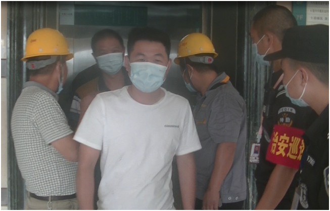 在演练模拟乘客乘坐电梯过程中,电梯由于故障停止运行,2名“乘客”被困在轿厢内。乘客利用轿厢内的应急报警装置(五方通话)向外界发出求救信号,值班人员接到求救信号后,随即启动了应急救援预案,迅速将情况用电话报告电梯维修人员与秩序维护人员、救援组迅速赶往现场,同时对被困人员进行心理安抚和情绪疏导沟通。与此同时,电梯维保人员5分钟内赶到现场,到达现场后,第一时间拉起黄色警戒线,建立作业区域围挡,确认轿厢位置,随后展开营救作业。