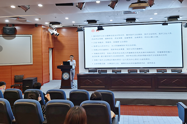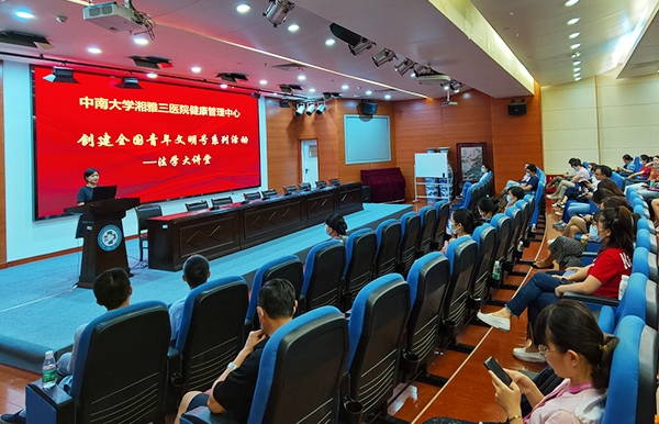 9月15日下午,健康管理中心“创建全国青年文明号系列活动之《法学大讲堂》”在外科楼二楼多功能会议厅开课。中国卫生法学会理事、湖南省法学会卫生法研究会副会长、中南大学医疗卫生法研究中心研究员、湖南银联律师事务所合伙人、副主任法医师周宇君受邀主讲《基本医疗卫生与健康促进法》,科室青年文明号号长李莹主持授课,健康管理中心全体职工参会学习并全部通过课后现场考核。
