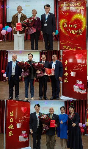 活动中庆祝了陈道谨、徐菊芬夫妇的金婚,之后为85岁高寿杨伯勋老书记和70岁寿星周向明、曹定安两位老同志庆祝寿诞。