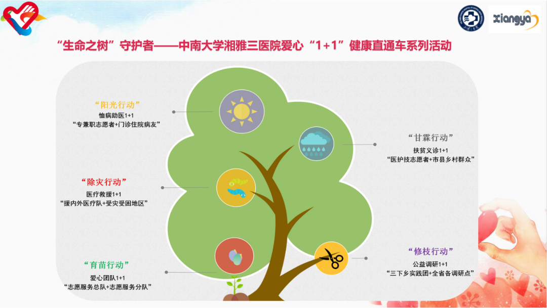 针对医疗卫生系统诸多“痛点”问题,在深入调研基础上,医院团委(医务社工与志愿服务指导中心)在过去多年医疗卫生志愿服务活动基础之上,于2019年起创新性策划推出“生命之树”守护者志愿服务项目。项目对接青年医护学子、门诊住院患者、市县乡村群众、政府主管部门、受灾受困人员五大群体探索和开展全方位、全流程、全生命周期医疗志愿服务,包含五大板块:(1)“育苗行动”——爱心团队1+1(院团委志愿服务总队+全院志愿服务分队),聚力组织建设,厚植爱心之苗;(2)“阳光行动”——恤病助医1+1(专兼职志愿者+来院住院就医病患),贴心关爱病友,撒播阳光之暖;(3)“甘霖行动”——扶贫义诊1+1(医院志愿者+地县乡村老幼群众),扶助基层群众,缓解久旱之渴;(4)“修枝行动”——公益调研1+1(志愿博士团+全省各地调研点),直击医疗系统,修正歪斜之枝;(5)“除灾行动”——医疗救援1+1(医疗救援队+受灾受困地区),力挽灾疫事故,破除灾害之困。项目立足医院,画出医疗志愿服务最美同心圆,初步构筑院前-院中-院后/院内-院外志愿服务闭环。