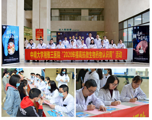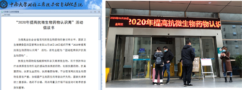 在本次“2020年提高抗微生物药物认识周”活动中,药学部通过在外科楼电子屏幕滚动显示宣传标语、门诊大厅摆放宣传海报、湘雅三医院官方公众号发布科普文章等多种形式向公众宣传正确使用抗微生物药物的相关知识。同时,药学部还联合医务部在医院办公系统发布抗微生物药物合理使用倡议书,号召全体医务人员共同参与;并将倡议书送往各科室医生及护士签名。呼吁所有人团结起来保护抗微生物药物,遏制微生物耐药,共同促进抗微生物药物的合理使用。