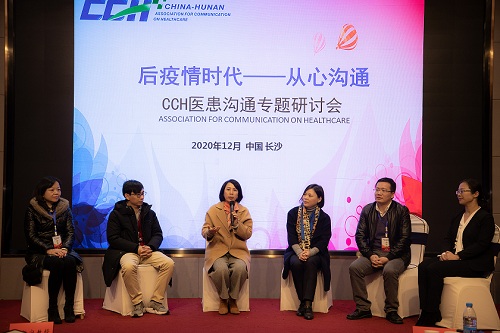 研讨会分为主题汇报和讨论分享两个环节,衔接期间播放由中南大学湘雅三医院党委宣传部制作的抗疫宣传片《印迹》,重温了医院在疫情期间发生的感人故事。随后,中南大学湘雅护理学院陈嘉教授以《做有温度、有担当的白衣天使》为题,对医学人文和护患沟通教育进行了精辟地阐释。曾经赴武汉参加抗疫以及在湖南投身省内抗疫的专委会成员相继做了主题汇报。湘雅医院重症医学科赵春光博士的《我的武汉保卫战》,湘雅二医院重症医学科徐敏博士的《疫战到底》,湘雅三医院移植科护士长刘佳《身着白衣,心有锦缎》,湘雅二医院护理部副主任张慧琳的《守护方舱,从“心”开始》,湘雅三医院内分泌科主任金萍《当DM遇上COVID-19》,湘雅二医院重症医学科主任李金秀《ICU的“重”要沟通》……充分展示出白衣天使们的担当、仁爱和专业。一个个暖心故事娓娓道来,一张张画面重现年初艰难而热血的时光。面对突如其来的未知病毒,疾病的迅速进展和亲人离去的双重打,恐慌与悲观情绪笼罩在许多患者心头。除了积极治疗和细心护理,医务人员做得最多的是给予患者们关心和鼓励,通过语言和非语言沟通,传递共情与人文关怀。在这一特殊历史时期,印证了特鲁多医生的名言“有时去治愈,常常去帮助,总是去安慰”。