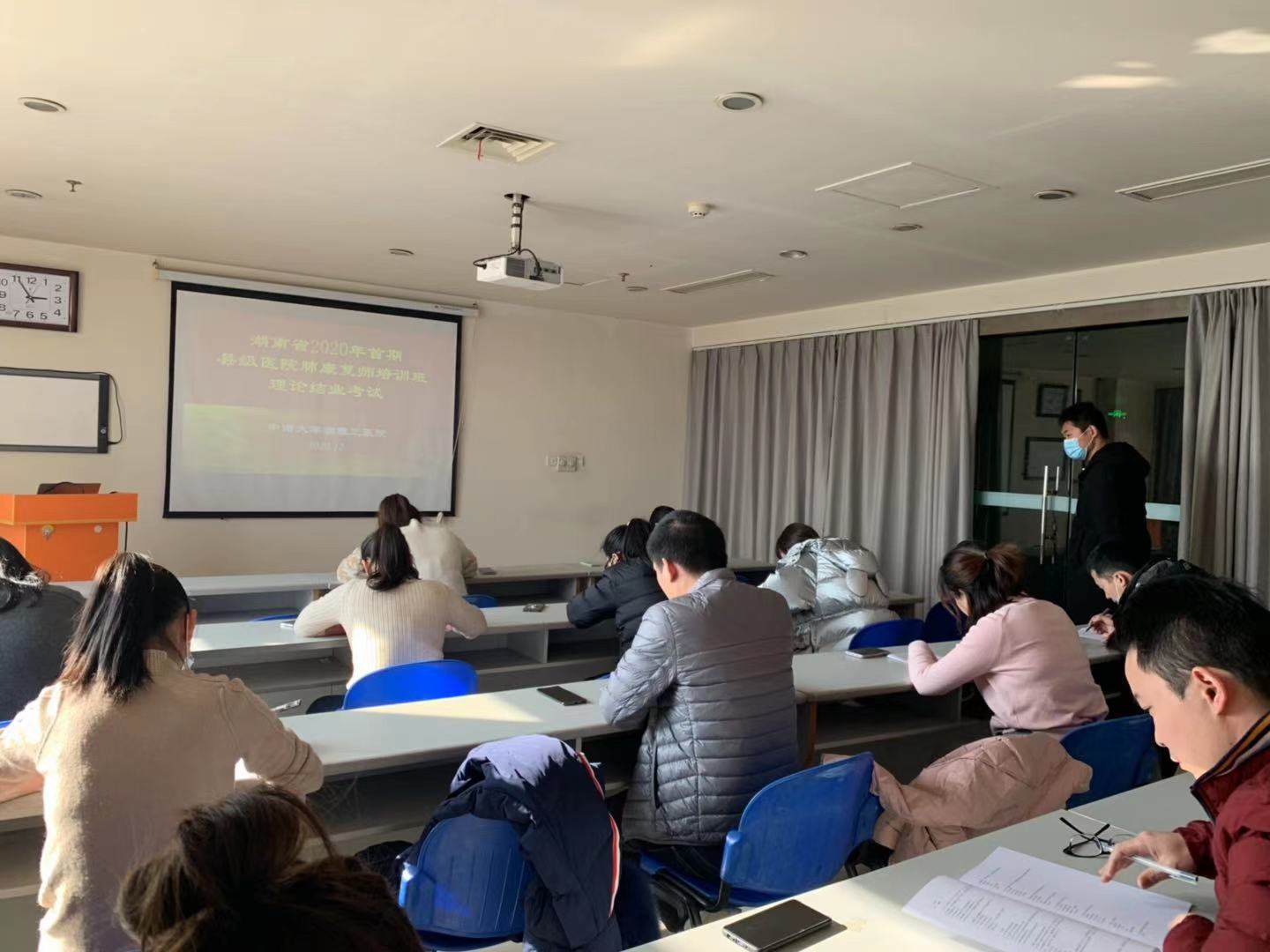 随后,全体学院参加了结业考核。由朱应东对技能考核进行督导,张小康对理论进行监考。技能考核通过现场抽签的形式,康复、护理老师对实际操作能力进行评分,考核完毕后由谢胜峰、李伟、龙检分别针对考核情况进行总结与点评。随后,学员两人一组进行肺康复病例汇报,现场由严谨、林桦、易琦峰、谢胜峰、杨阳进行打分与点评。全体学员们均以优异成绩通过考核。