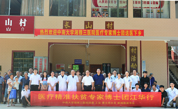 中南大学湘雅三医院“三下乡”志愿扶贫博士团是在医院党委领导下,由医院团委牵头成立的志愿组织与扶贫团体,团队组建旨在响应国家、湖南省及中南大学关于精准扶贫与对口支援的工作号召,推动卫生、科技、文化“三下乡”,从而“走进贫困地区,扶助基层群众,彰显青年担当,以真情对口支援,让爱心传递希望”,为脱贫攻坚与健康中国战略落地贡献力量。