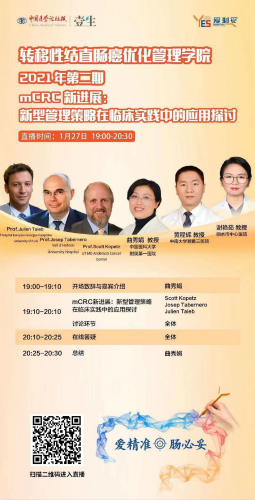 1月27日晚,中南大学湘雅三医院肿瘤科副主任黄程辉连线美国安德森癌症中心胃肠肿瘤科Kopetz教授、西班牙瓦尔德希布伦大学医学院肿瘤研究所Josep教授、法国巴黎蓬皮杜大学欧洲医院Julien教授、中国医科大学第一附属医院曲秀娟教授及浙江省丽水市中心医院肿瘤科谢艳茹教授,就结、直肠癌精准治疗的热点话题及病例进行了热烈的探讨及经验分享。