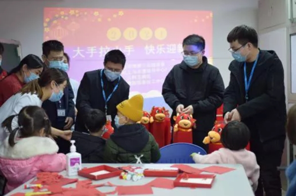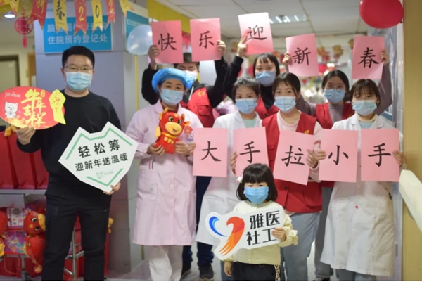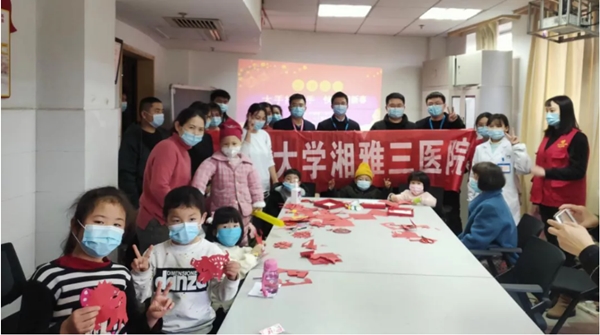 1月28日下午,中南大学湘雅三医院团委(医务社工与志愿服务指导中心)、湖南省雅医医务社会工作中心、湘雅三医院儿科五病区在公益伙伴的支持下携手举行了“大手拉小手 快乐迎新春”新年主题活动。中南大学医管处处长、湘雅三医院党委委员、副院长吕奔及湘雅三医院儿科、院团委(医务社工与志愿服务指导中心)、轻松筹微爱业务中心负责人,驻点医务社工、轻松公益合作伙伴和爱心志愿者到达现场为住院患儿送上节日的祝福。
