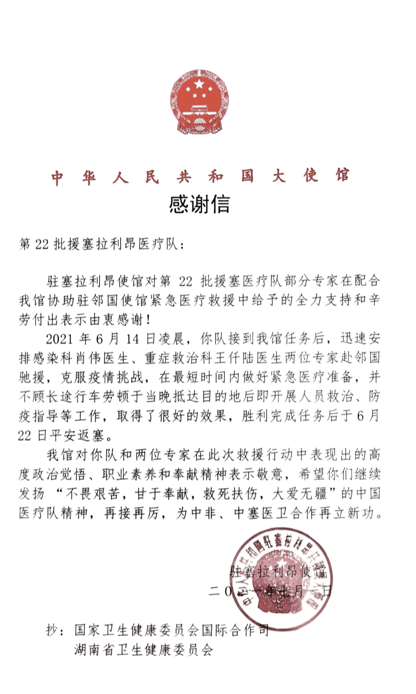 7月1日,驻塞拉利昂使馆发来感谢信,感谢第22批援塞医疗队在配合使馆协助邻国使馆紧急医疗救援中给予的支持和付出。