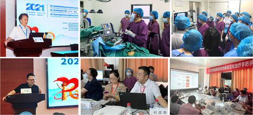 7日-9日的会前培训同样精彩纷呈,期间主办了“第三届湘雅三医院内镜黏膜下剥离术(ESD)及内镜精灵手把手培训班、超声内镜(EUS)手把手高训班、2021双气囊小肠镜(DBE))论坛及食管胃静脉曲张及内痔规范化治疗手把手培训班”,湖南省医师协会副秘书长郭洁,中南大学湘雅三医院党委书记何庆南,党委委员、副院长欧阳文,党委委员、副院长朱利勇分别为内镜培训会致辞,肯定了消化内科在省内开展的创新性内镜技术、规范化培训及普及、内镜人才培养等方面做出了大量富有成效的工作,带领团队在国际消化内镜舞台多次发出“湘雅声音”。本次会前手把手培训班实战性强,就内镜下切除、人工智能、超声内镜、ERCP、小肠镜、食管静脉曲张及内痔治疗等方面,邀请本领域国内顶尖专家进行专题讲座、内镜演示及手把手培训,吸引来自湖南、湖北、贵州等省内外100余名消化内镜医师来交流学习,大家热情高涨、收获颇丰。大国工匠、复旦大学附属中山医院内镜中心主任周平红教授演示湖南省首例内镜下胆囊切除术的高难度创新技术,是本届手把手培训班的亮点。该技术实现胆囊切除的微创治疗,全身无创口,术后第二天病人康复。