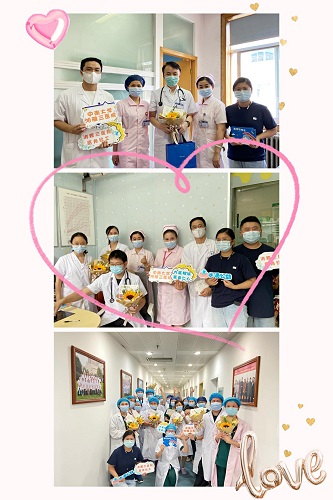 儿科五病区护士长蔡骞与驻点医务社工、水滴公益工作人员还一起前往儿科门急诊、儿保中心、重症监护室,为医务工作者们送上节日祝福。正在儿科坐诊的院党委书记何庆南教授见到社工、志愿者一行的到来对活动的举行表示充分肯定,并与大家亲切合影留念。