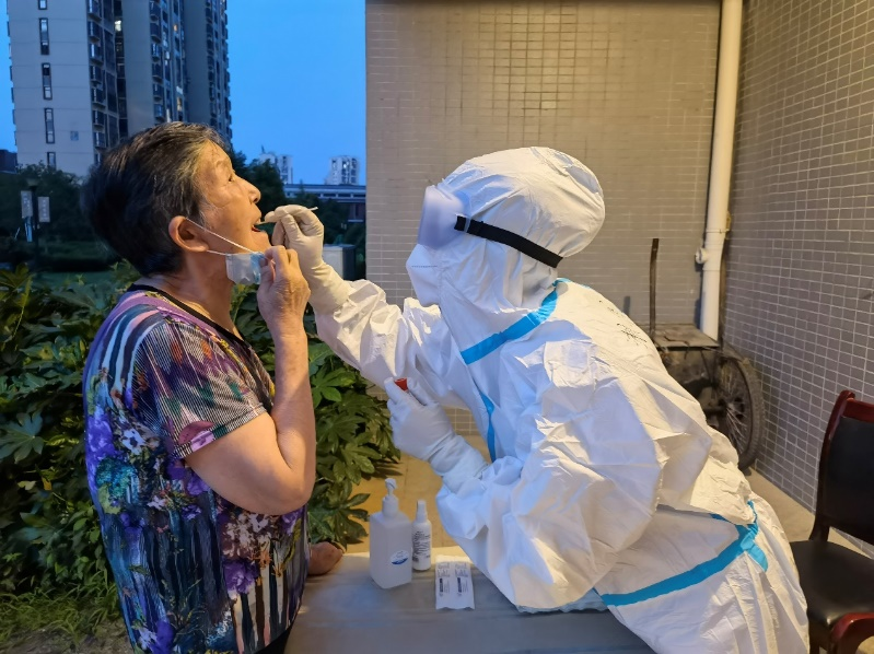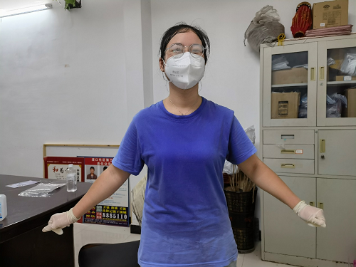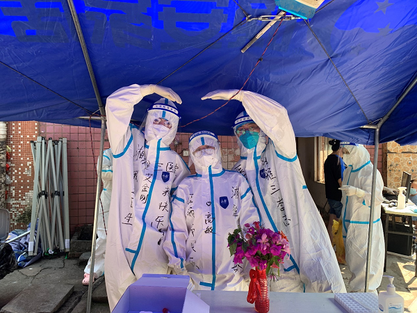 正值盛夏,队员们顶烈日、战高温、熬长夜,守卫“国际张”。在炎炎烈日下,穿戴着密不通风的口罩、乳胶手套和防护服,几分钟汗水就能浸湿全身。队员沈倩在日记中写道:“穿上防护服的我做事不太灵活,消毒液很滑,采样瓶拧不开,密封袋打不开,身体也有一些不适感,汗水在身上流淌,口罩被汗液浸湿,眼镜也慢慢的被雾气遮住……我告诉自己,我可以的,我能坚持。”核医学科李建医生日记中也提到:“因为带眼镜的缘故,护目镜及口罩压在面部的不适也渐渐体现了出来,加上长时间站立和弯腰为社区居民进行核酸采样,在这种条件下持续高强度工作了八个多小时,中途没吃饭,中间一度出现了低血糖,缺氧和憋闷等状况。但早日战胜疫情的坚定信念和使命,使我咬牙坚持了下来,圆满的完成了任务,一天繁重的工作过后,湿漉漉的全身都是汗水,累得全身酸痛。” 无论任务多么艰巨,没有人在困难面前退缩,从咬牙坚持到逐渐适应,队员们甚至纷纷调侃这20天在防护服里蒸桑拿,让自己实现了多年来停留在嘴上的“减肥梦”。