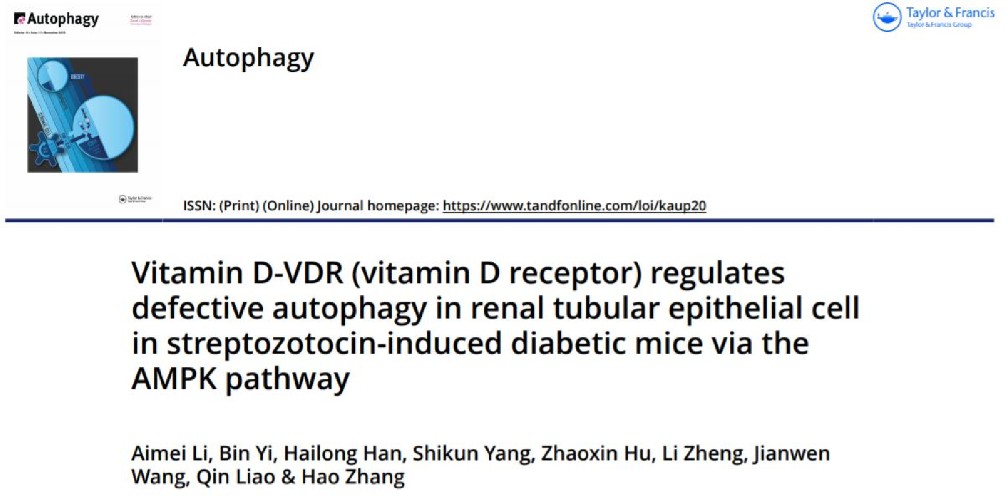 8月25日,中南大学湘雅三医院肾内科张浩教授团队在生物学Top期刊Autophagy(IF=16.016)上独立发表题为“Vitamin D-VDR (vitamin D receptor) regulates defective autophagy in renal tubular epithelial cell in streptozotocin-induced diabetic mice via the AMPK pathway”的原创研究论文。张浩教授为唯一通讯作者,湘雅三医院肾内科李爱梅博士、易斌副教授,中南大学生命科学学院韩海龙博士为共同第一作者。