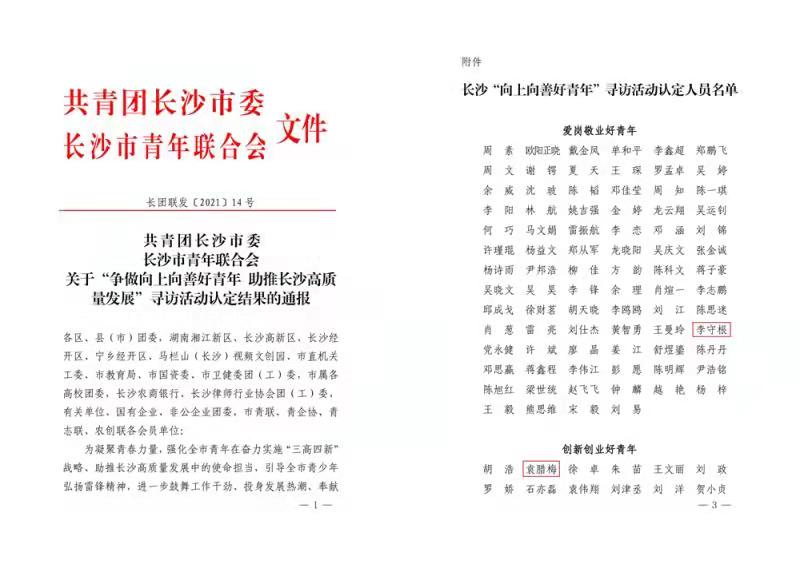 9月15日,共青团长沙市委、长沙市青年联合会通报关于“争做向上向善好青年 助推长沙高质量发展”寻访活动认定结果,经院党委批准、院团委及岳麓区团委等推报,中南大学湘雅三医院团委委员、急诊科副护士长李守根获评“爱岗敬业好青年”,中南大学湘雅三医院医学实验中心副研究员、硕士研究生导师袁腊梅获评“创新创业好青年”。