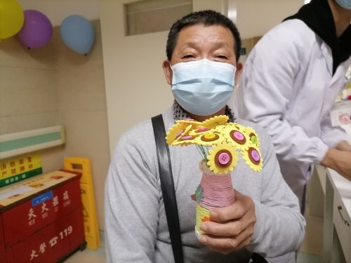 活动开始前,老年心理全科医学党支部书记王炼教授、老年病科主任刘宗道分别致开场辞,为老年朋友送上了重阳节浓浓的问候和祝福。第一个开场小游戏“击鼓传花”很快活跃了现场的气氛,拉近了大家的距离。随后,护士长颜萍平、副护士长曾晖和老人们学习了“健康手指操”和制作手工“纽扣花”,简单而益智的手指操和手工DIY很快吸引了大家的注意。伴随着欢快的背景音乐,老人们学得很认真,做得很开心,现场氛围十分融洽,当场完成作品的老人还获得了精心准备的奖励大礼包,脸上展露出满满的成就感。