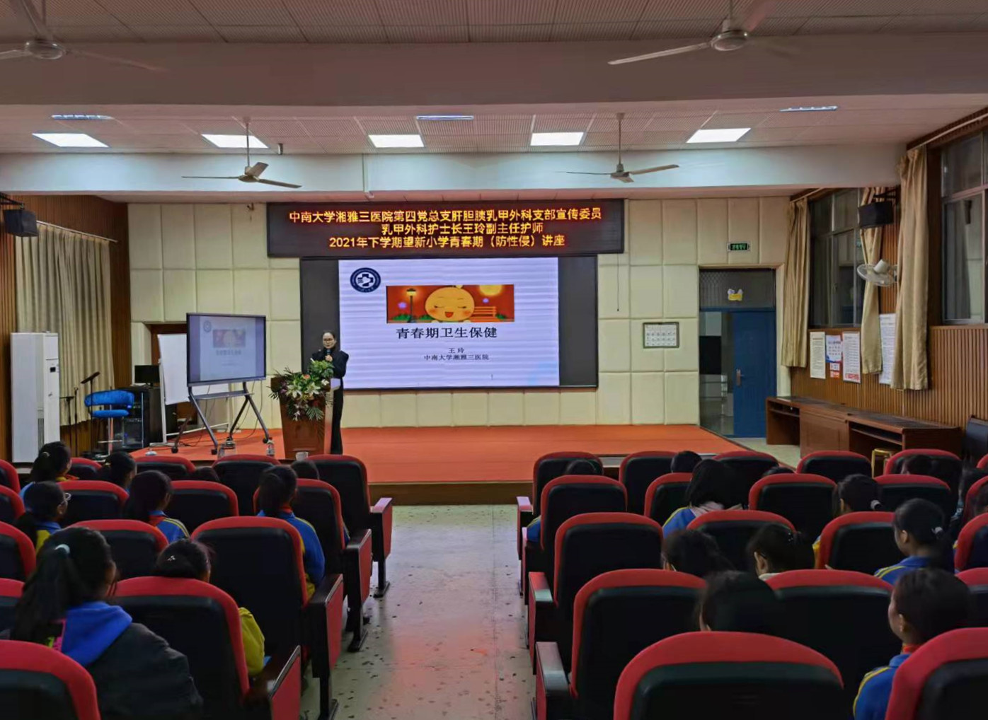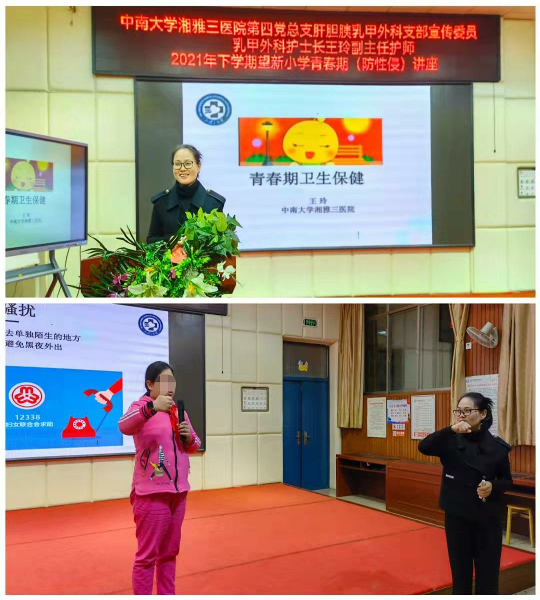 建党百年之际,为弘扬健康宣教进社区的服务精神,提高校园青春期女生健康安全意识,促进党组织建设及与区域联动,10月21日上午,由中南大学湘雅三医院第四党总支肝胆胰乳甲外科支部、院团委、乳甲外科联合望新小学举办的“护航青春,远离伤害”防性侵安全教育专题讲座成功举行。第四党总支宣传委员、乳甲外科护士长王玲为望新小学六年级全体女生进行防性侵指导,共125名女生参加了此次讲座。