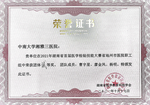 由湖南省医学教育科技学会举办、中南大学湘雅三医院医学检验系承办的湖南省首届医学检验技能大赛暨学术交流会于10月底在长沙举行。由检验科曹宇星、廖金凤、杨明组成的湘雅三医院团队在大赛中荣获二等奖。