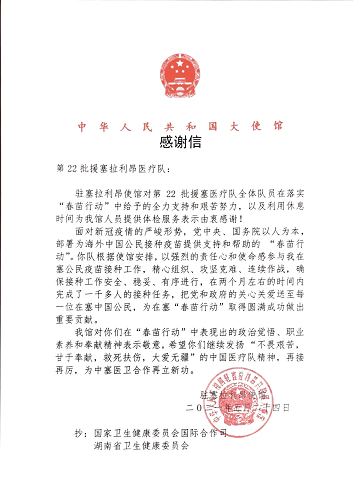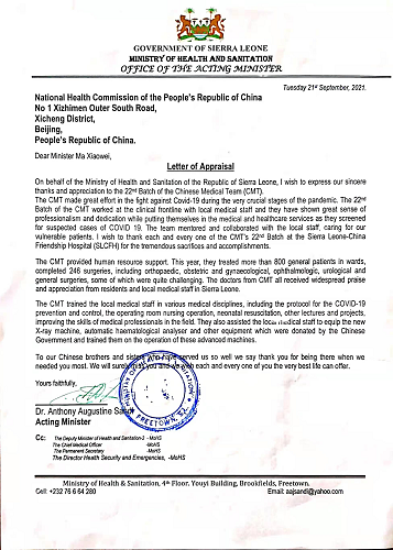 不久前收到塞拉利昂卫生部写给医疗队的感谢信,不由得感慨万千。中国第22批援塞拉利昂医疗队是湖南省卫生健康委派遣,以中南大学湘雅三医院为主建单位的援外医疗队,总共20名成员,其中湘雅三医院派出8名医护人员:包括医疗队队长肝胆胰外科冯超,妇科孙信、骨科沈民仁、心内科曾丽雄、传染科肖伟、ICU王仟陆、检验科屈琳、急诊科向林军,自2020年9月18日抵达塞拉利昂后正式开始援非工作。回首来时路,这400多个日日夜夜历历在目;细思是与非,这万水千山外的风风雨雨声声入耳。