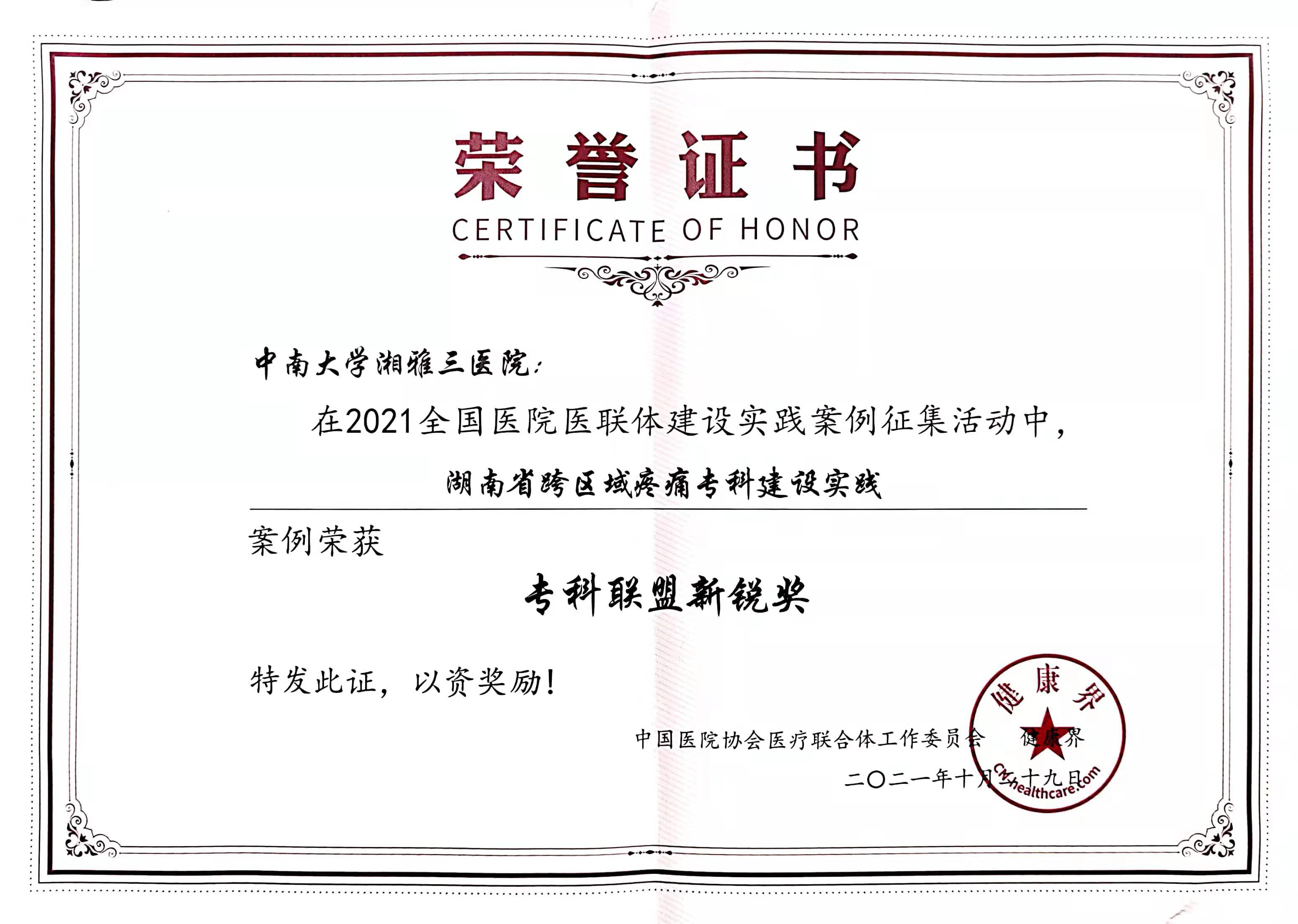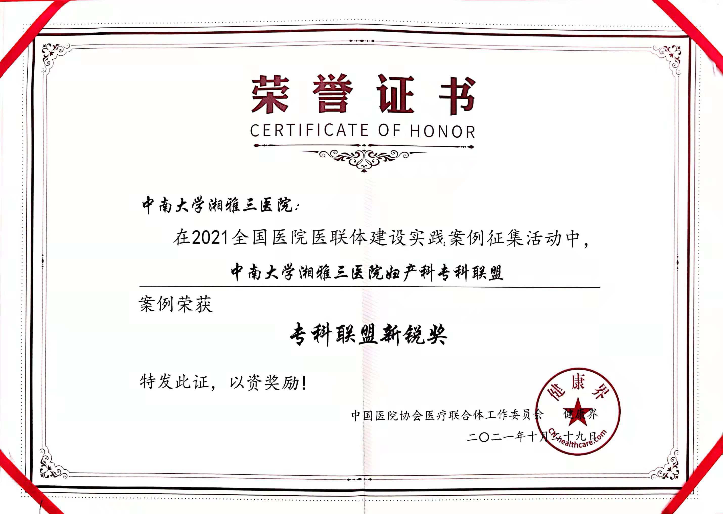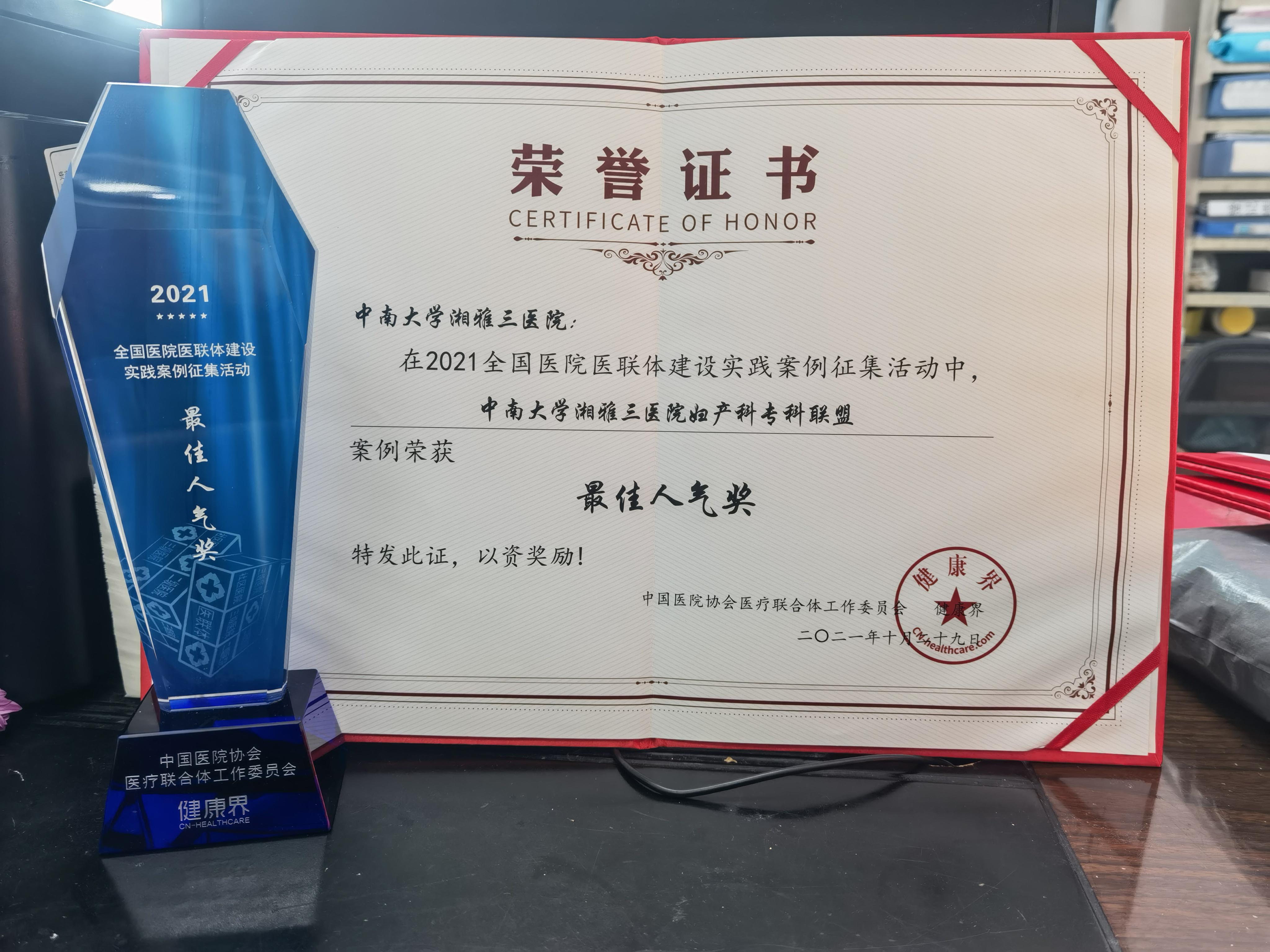 近日,由中南大学湘雅三医院社会服务中心与妇产科、疼痛科联合申报的案例《中南大学湘雅三医院妇产科专科联盟》和《湖南省跨区域疼痛专科建设》,在2021全国医院医联体建设实践案例大赛中荣获“最佳人气奖”及“专科联盟新锐奖”。“医建共襄,联动发展”为主题的“2021年全国医院医联体建设实践案例征集活动”是在中国医院协会医疗联合体工作委员会的指导下,由健康界牵头主办,旨在积极响应“十四五”规划,全力推进公立医院高质量发展,持续推动医联体建设。