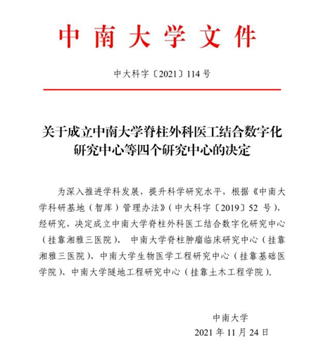 2021年11月24日,中南大学官网公布《关于成立中南大学脊柱外科医工结合数字化研究中心等四个研究中心的决定》文件,成立的四个中心中的两个:“中南大学脊柱外科医工结合数字化研究中心”和“中南大学脊柱肿瘤临床研究中心”均挂靠湘雅三医院,此次“两个中心”的挂靠将促进湘雅三医院脊柱外科进一步发展。