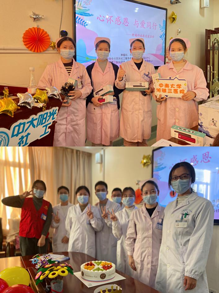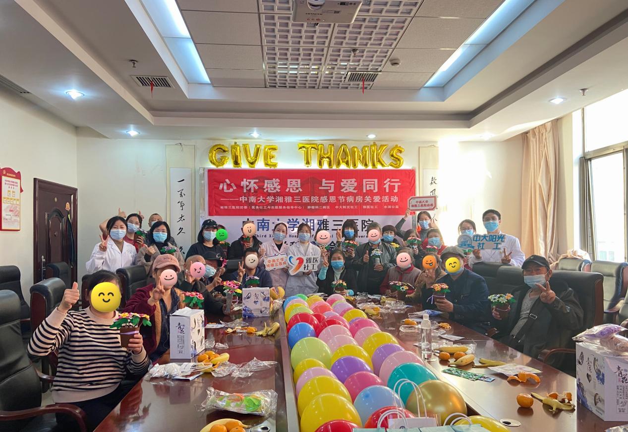 感恩是中华文明的传统,是和谐社会的道德基石。11月25日下午,正值感恩节,中南大学湘雅三医院团委、医务社工与志愿服务指导中心联合医院肿瘤科及长沙市中大阳光社工服务中心、湖南省雅医医务社会工作中心、水滴公益在放疗中心二楼会议室开展“心怀感恩,与爱同行”病房关爱活动。肿瘤科医护人员、患者及其家属等40余人参与了活动。科室主任和护士长对活动开展表示肯定。