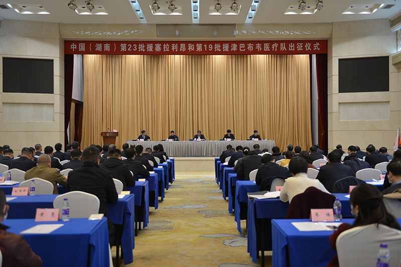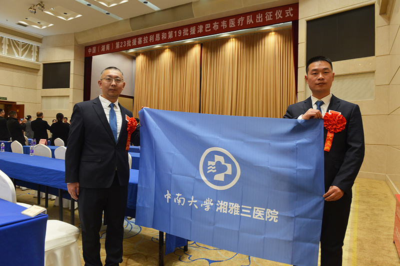 12月22日,中国(湖南)第23批援塞拉利昂和第19批援津巴布韦医疗队出征仪式在长沙举行,中南大学湘雅三医院肖际东、王潇作为中国(湖南)第23批援塞拉利昂医疗队队员出席出征仪式。省委常委、常务副省长李殿勋授旗并讲话。援塞医疗队副队长肖际东与队长周曦一道接过并展示队旗。