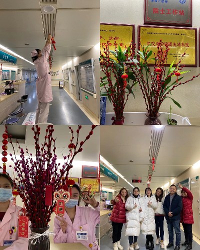春节,是万家团圆的日子,除夕夜,新年到!15病区大半的病友们都已经踏上了回家的路程,但仍有几位因为病情特殊没能与家人团聚的病友。为营造红红火火的过年氛围,护士长苏红辉组织大家挂起了象征吉祥的大红灯笼,玻璃上也贴上了雕花镂空的“福”字,摆在护士站的那盆银杨柳在这喜庆的大红色映衬下也更加活泼讨喜,科室的年味儿一下子就足了起来,看着在大家共同努力下精心完成的这一切,我觉得我不是在工作,而是有幸处在一个温馨的大家庭中,和来自五湖四海的家人们共度这个难忘的春节。