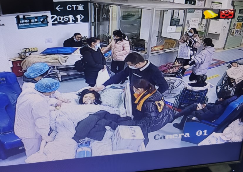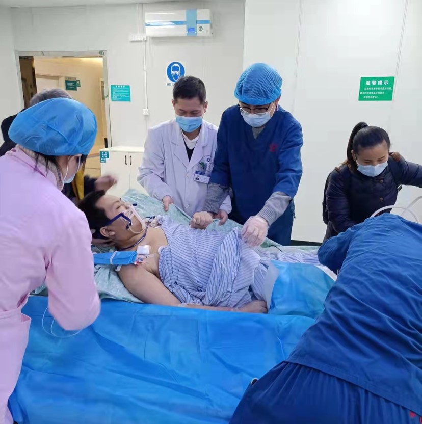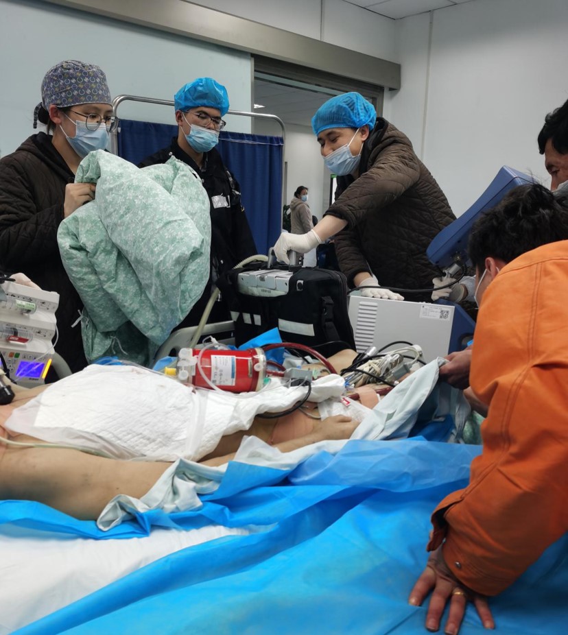 15:35,一位行ECMO救治的急诊患者被送到CT室,患者携带呼吸机、注射泵、各种引流袋、ECMO机器和管道。CT室技师、护士齐上阵,整理各种管道,稳妥放置抢救仪器,和急诊科、ICU同道一起快速、熟练、安全地给患者完成了CT检查,争取更多的抢救时间。