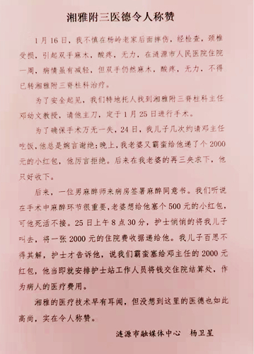 邓幼文教授在年前接诊了慕名而来的患者杨大叔,将其收治入院。因接近年关,儿女远在北京,杨大叔担心此时入院可能无法与家人春节团聚,有些焦虑。杨驰在查房时察觉到患者情绪不佳,多次与其交谈,宽慰患者;邓幼文为缓解患者的焦虑情绪,每天下手术台后都会来到患者床旁耐心地为其答疑解惑。通过脊柱外科医护团队的共同努力,患者的焦虑情绪明显好转。为“确保”手术万无一失,手术前患者家属悄悄将红包塞给邓幼文,在多次拒绝后,家属依旧不肯收回,为让患者及家属安心,邓幼文只好暂时收下红包,立即请杨驰将钱交到结算中心用做患者的住院医疗费用。出院前,在得知邓幼文把红包抵作住院医疗费用后,患者感概地说道:“新湘雅的医生们真是医者精诚的典范。”感动之余,患者写下了这封《湘雅附三医德令人称赞》的感谢信。