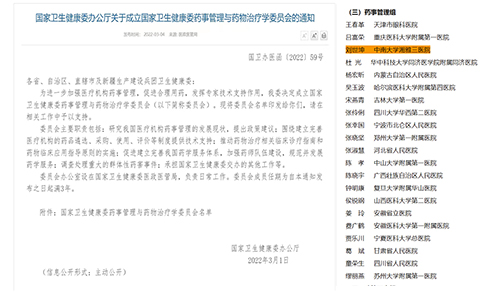 为进一步加强医疗机构药事管理,促进合理用药,发挥专家技术支持作用,3月4日,国家卫生健康委办公厅发布关于成立国家卫生健康委药事管理与药物治疗学委员会的通知,中南大学湘雅三医院药学部刘世坤主任药师当选国家卫生健康委药事管理与药物治疗学委员会-药事管理组委员。
