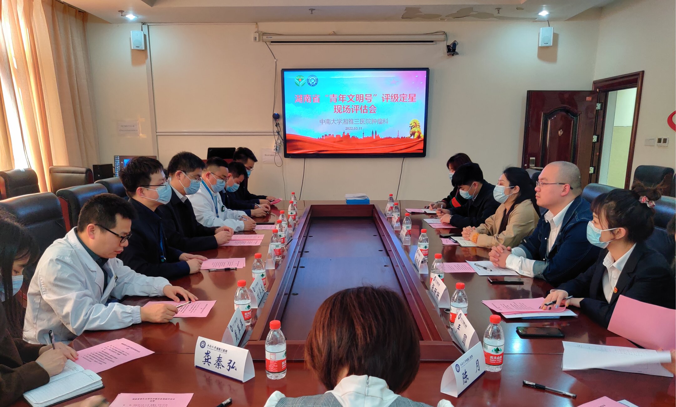 3月11日下午,团省委青年发展部副部长刘颖琦一行来到中南大学湘雅三医院检查指导青年文明号创建工作,并对2019-2020年度湖南省青年文明号获评单位中南大学湘雅三医院肿瘤科进行评级定星现场评估。医院党委委员、副院长朱利勇,团委书记程海威,肿瘤科代理主任曹科,副主任、护士长、党支部支委、青年代表等相关人员参加现场评估会议。