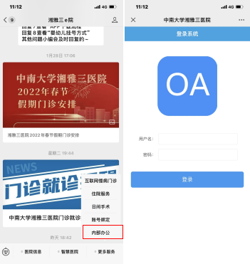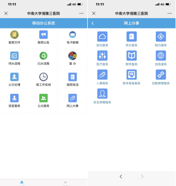 移动端,湘雅三医院办公系统接入微信公众号,只需要在公众号搜索“湘雅三e院”(绿色)图标,选择“内部办公”按钮即可进入。移动线上办公新增了所有流程的查阅、审批,网上办事申请单发起等功能,与线下办公系统功能同步,将办公装进“口袋”。
