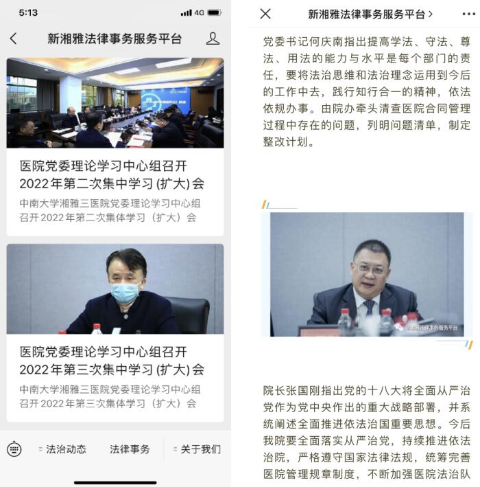 3月28日,湘雅三医院“新湘雅法律事务服务平台”正式上线。医院职工可通过该平台享受到专业、高效、便捷的一站式在线法律服务。服务平台从事前预防、事中防控、事后化解法律风险的全过程着手,致力解决临床一线人员、行政管理人员工作和生活中遇到的法律问题。