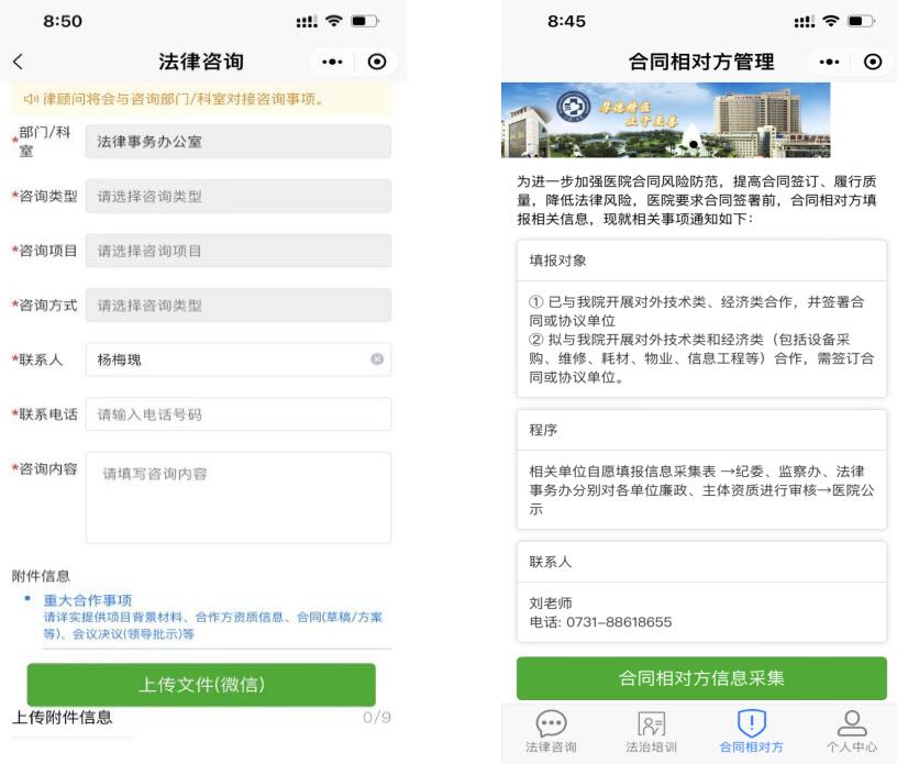 “新湘雅法律事务平台”包含法治前沿、法律咨询、法治培训、合同相对方管理四大功能。法治前沿模块,收录最新的卫生健康法治新闻、医院法治建设工作、最新法律法规及司法解释等内容。通过法律咨询模块,职工可通过线上登记咨询事项,法律顾问接受信息后及时与当事人对接,并提供专业法律建议,咨询完成后当事人可从服务专业性、及时性、态度三方面进行评价,评价情况将作为法律顾问日常考核内容之一。在法治培训模块,部门/科室负责人可根据管理需求,预约专家开展普法宣传和法治培训。合同相对方管理模块用于合同相对方提交基本信息和相关资质,与天眼查、企查查实行关联,及时反馈相对方重大经济、重大诉讼等信息,为医院选择合作方和合同履行风险提供评价依据。