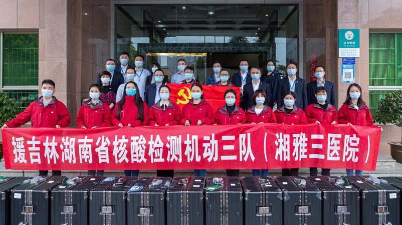 这是我第二次带队出征,忐忑、激动与坚定的信念,一直在我心中徘徊。带着领导和同事们的殷殷期盼,家人们的不舍,2022年3月14日,我们湘雅三医院12人核酸检测队和湖南省核酸检测队其他队员一起,共150余人登上了飞往吉林长春的包机。12名同志中有10名在今年1月份去过安阳抗疫,另外的2名同志也一直坚持守在医院抗疫的第一线,都是核酸检测的能手。