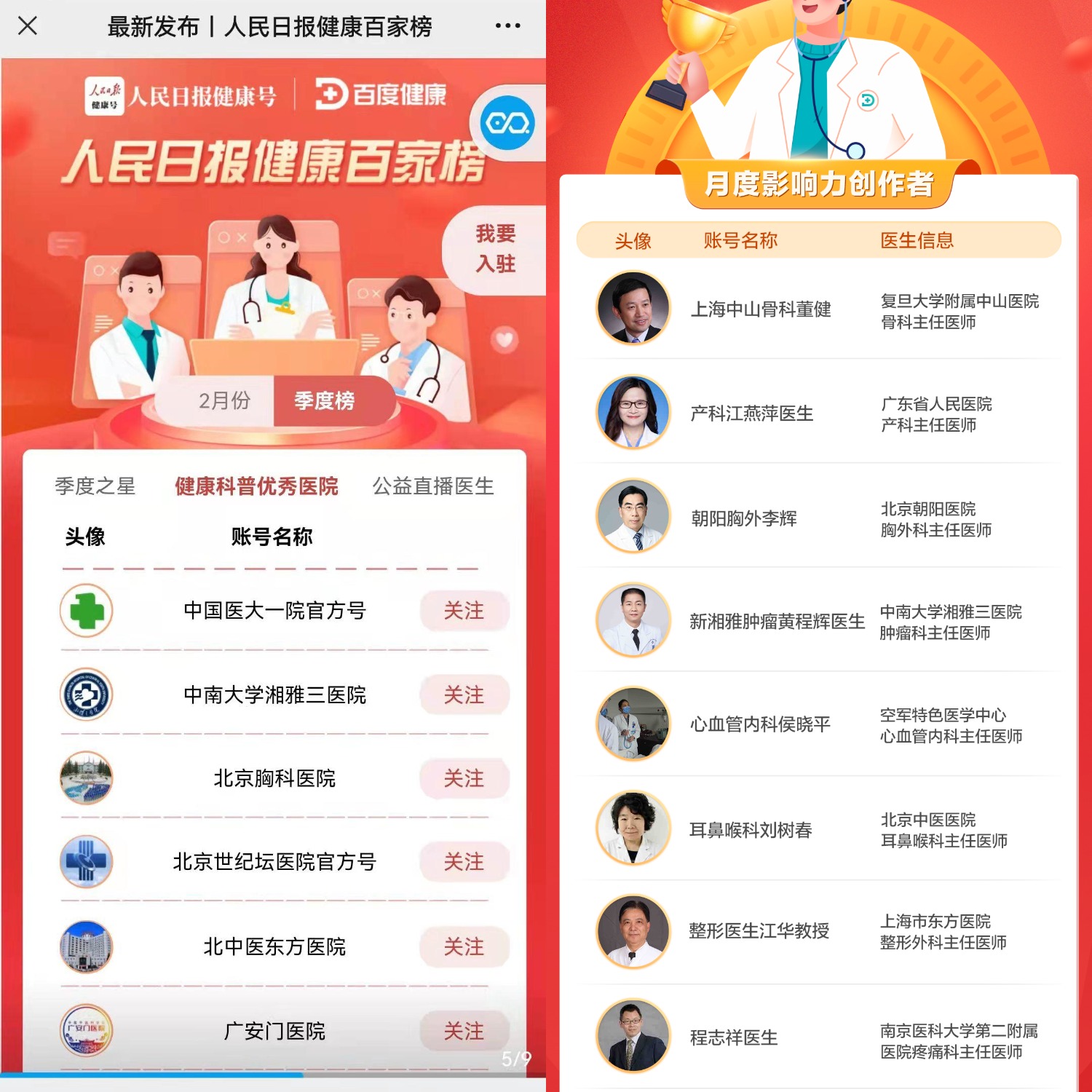 近日,中南大学湘雅三医院荣登人民日报健康百家榜并获2022年一季度“健康科普优秀医院”,“新湘雅肿瘤黄程辉医生”科普号获人民日报健康百家榜2022年2月份“月度影响力创作者”称号。