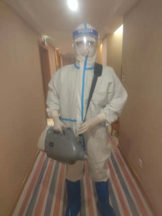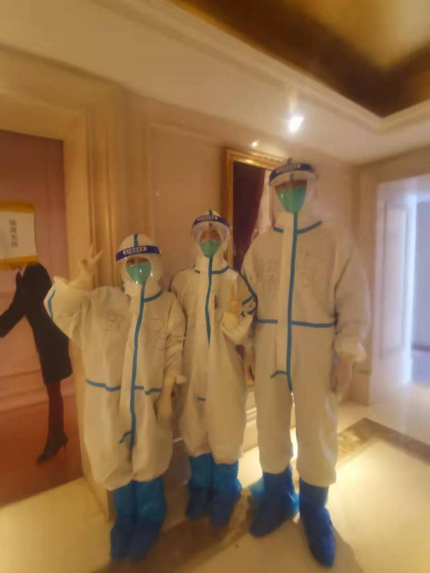 初入隔离酒店即受到政府领导和航天医院医疗组的热烈欢迎,因时间紧迫,简单交接后随即开展了包括人员登记、物资发放、体温测量、核酸采样、餐食配送、环境消杀、垃圾处理、余氯监测等工作。