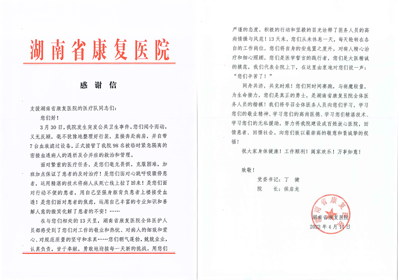 4月11日,中南大学湘雅三医院肾脏风湿免疫科支援湖南省康复医院血透室一行6名医护人员凯旋。从3月31日临时接到通知至4月11日共12天,支援医疗组为68名透析病人提供透析治疗257次,帮助透析病人安然度过隔离期,实现工作人员及透析患者零感染。此次支援,受到康复医院全体人员的致信表扬,充分展现了新湘雅精湛技术以及新湘雅人的使命与担当。