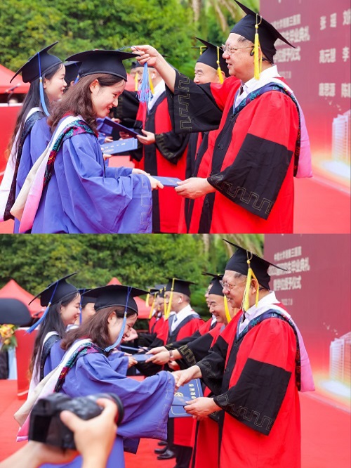 朱晒红宣读了《湘雅三医院2022年研究生学位授予名单》及《湘雅三医院获得2022届湖南省、中南大学优秀毕业生名单》,院领导和导师们为毕业生进行了颁发学位证书及拨穗仪式,与每一位毕业生亲切握手并送上贴心的叮嘱。随后,杨大远同学和周月异同学深情演唱了《相聚湘雅 医路为家》为毕业生们送上祝福。